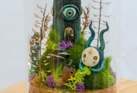 Louille Illustre crée des mondes oniriques miniatures peuplés de créatures fantastiques, sorcières et esprits. Entre dioramas sous cloche, sculptures, linogravures et masques en bois, chaque œuvre raconte une histoire et invite à l’évasion.