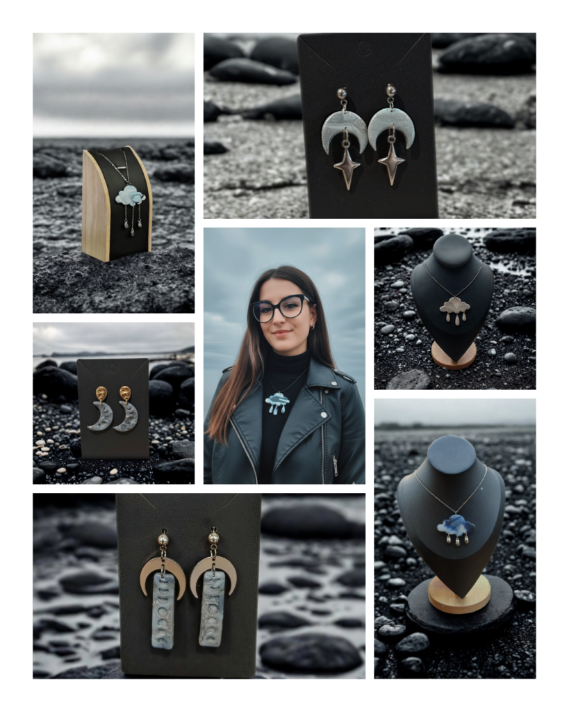 un fragment de lune suspendu à une oreille, un nuage chargé d’orage, ou encore l’éclat discret d’une étoile au creux d’un bijou.
